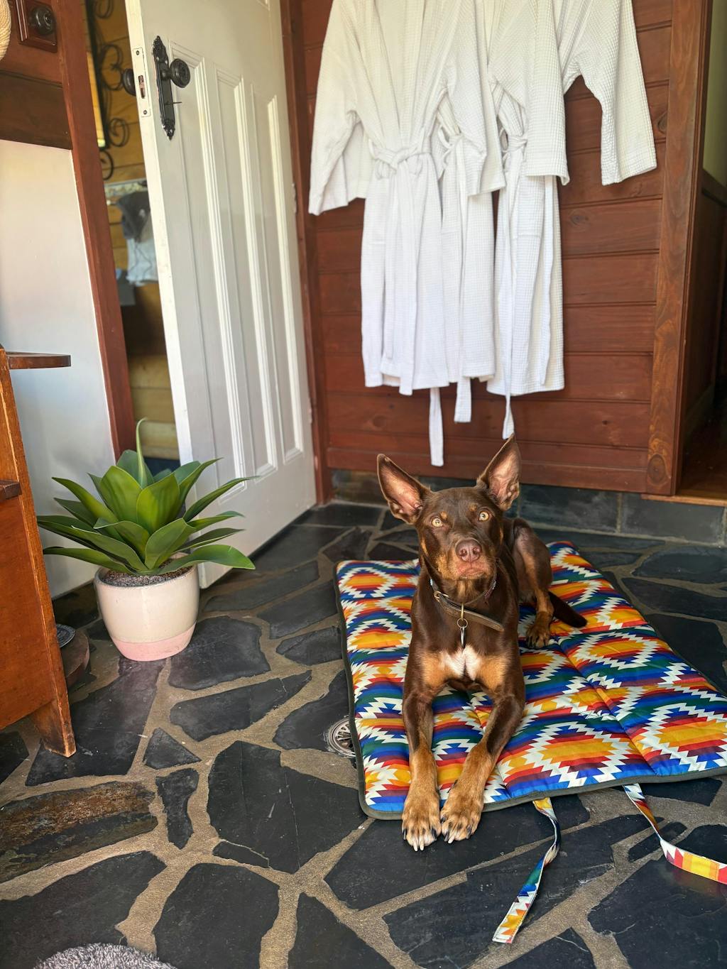 The Adventure Ready Travel Mat measures 100cm x 70cm — plenty of room for dogs of all sizes to stretch out after a big day on the trails. Rolls up compact with an easy-carry handle, so it fits neatly in your backpack, car boot, or caravan without taking up precious space.